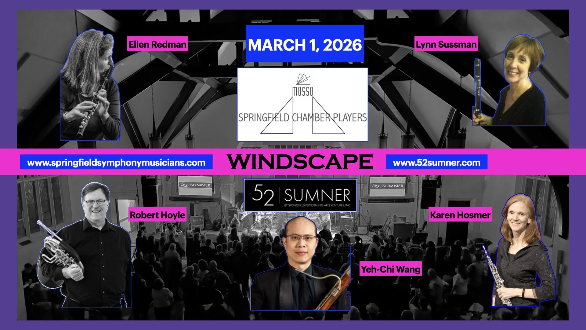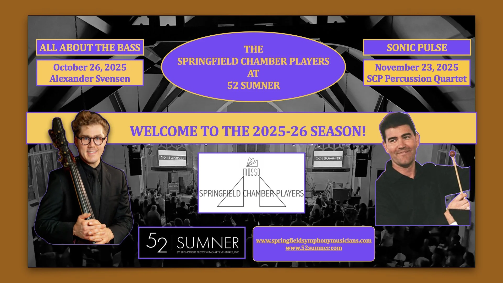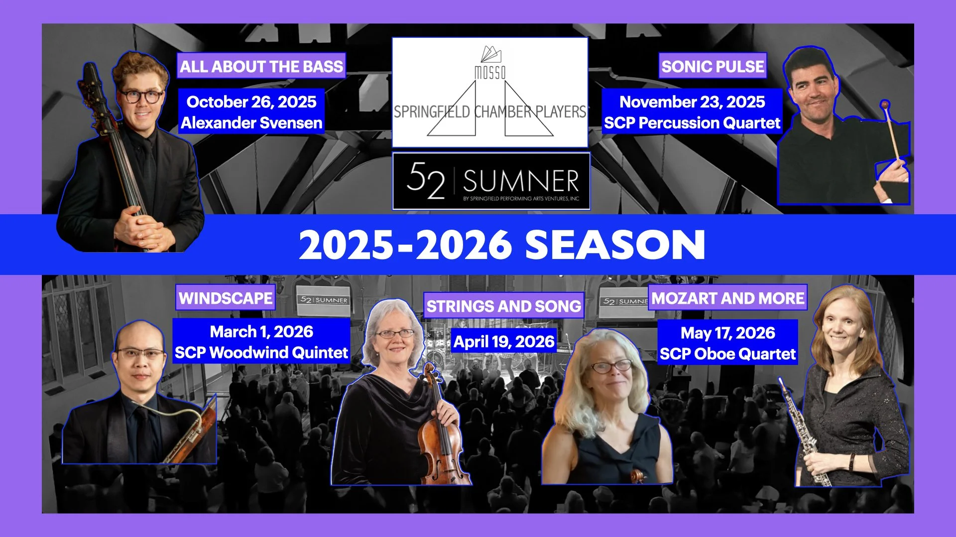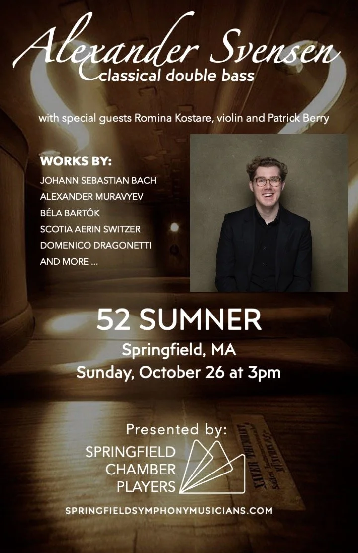 JOIN US FOR OUR SECOND SEASON AT 52 SUMNER !!! Five Sunday afternoons showcasing more musicians of the Springfield Symphony Orchestra, performing with their colleagues from their respective sections. Hear a double bass recital by Alexander Svensen; a percussion quartet led by Nathan Lassell; a woodwind quintet led by Yeh-Chi Wang; a strings and voice program with violinist Kathy Andrew and violist Elizabeth Rose; and the SCP Oboe Quartet with Karen Hosmer.