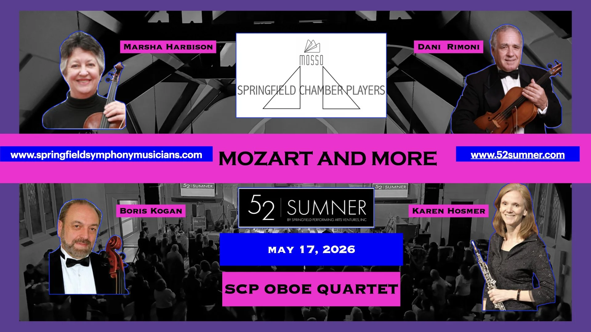 MOSSO Update 6/25/2024: The Springfield Chamber Players (MOSSO) and the nonprofit Springfield Performing Arts Ventures, Inc. (SPAV) announce their partnership to present the Springfield Chamber Players at 52 Sumner, the new performance venue at 52 Sumner Avenue, Springfield. The Springfield Chamber Players (SCP) will present a six-concert series, beginning in October, to launch the 2024-25 season. 52 Sumner is located on the corner of Sumner and Ft. Pleasant Avenues in the Forest Park section of Springfield. The venue is in the former Faith Church, and has ample parking and easy access to I-91. We'll be announcing the season in late summer, and those on our mailing list will have the first opportunity to purchase tickets. Learn more about 52 Sumner and add your name to our eblast list.